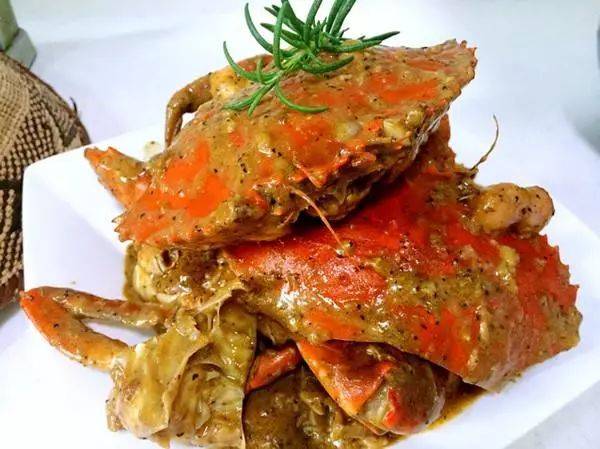 新加坡黑胡椒螃蟹是中餐和西餐相結合的一種創新菜,有炒和烤兩種。黑胡椒香料恰如其分地滲入肉中,有新加坡菜典型的口味濃郁的風格,香濃可口,略微發甜,回味複合味兒渾然一體。