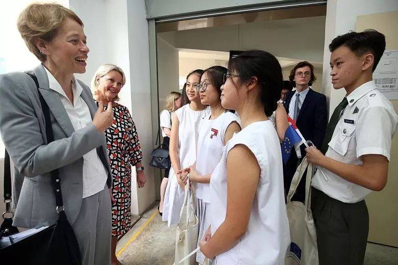 歐盟駐新加坡大使Barbara Plinkert(左)和芬蘭大使Paula Parviainen在昨天的小組討論後對學生們說。歐洲大使將訪問當地學校,就歐盟問題進行會談。(圖源:聯合早報)