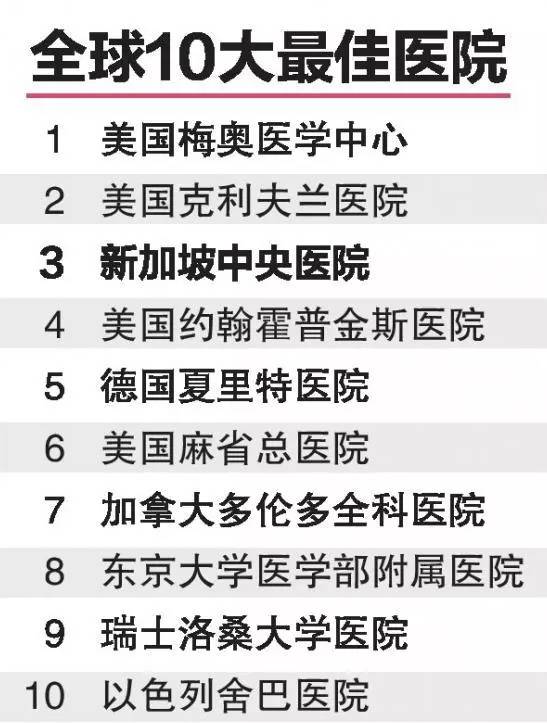 新加坡中央醫院表現亮眼,緊跟在美國梅奧醫學中心(Mayo Clinic)和美國克利夫蘭醫院(Cleveland Clinic)之後,排名第三。