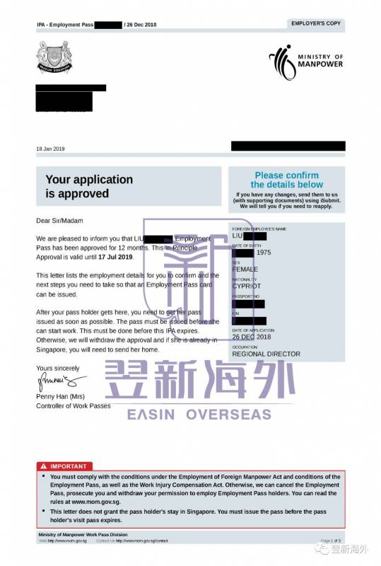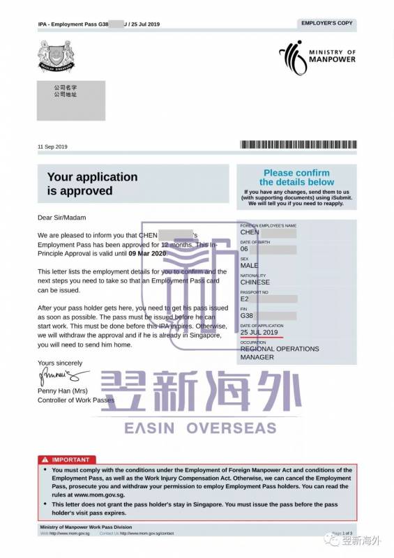 在一個半月的服務周期內,爲客戶成功申請到有效期爲一年的EP准證。