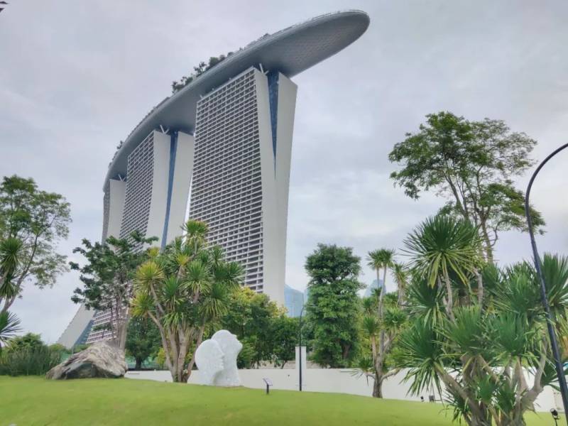 頂部像船一樣的大樓就是世界最昂貴酒店之一的金沙酒店。酒店最頂層57層有景色絕美的空中泳池,56層有遊客可上去參觀的空中花園,俯瞰周圍城市景色。蓮花狀的建築物是藝術博物館。