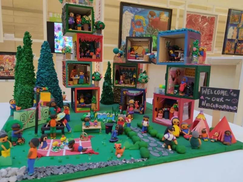 兒子在兒童展館玩遊戲的時候,工作人員介紹我們去底層的學生作品展。那是一個好地方,裏面展示的是新加坡小學生們的手工作品。兒子很感興趣,可能看得很有共鳴。他饒有興趣地一個個欣賞,還選出了他心中的最高分作品。