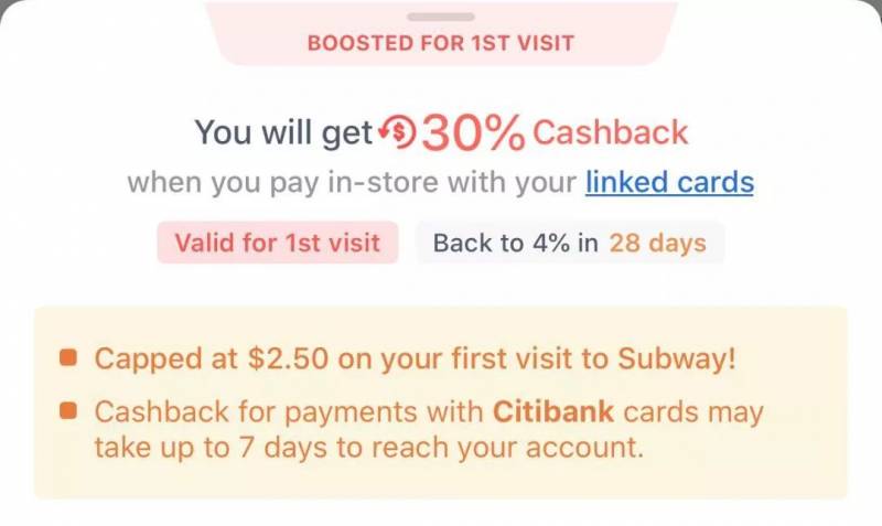 坡坡的Subway最近和返利軟件shopback達成了合作,只要用shopback關聯的銀行卡,首次購買Subway可以享受30%的返現哦!活動截止時間爲12月12日,感興趣的小夥伴不要錯過!