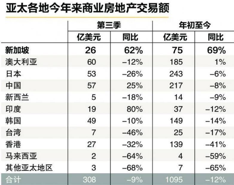 另一方面,在今年第三季,香港交易額同比下跌了32%;與此同時,整個亞太地區的地産投資亦是頹勢難掩。