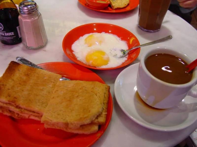 兩片烤的焦香酥脆的吐司裏夾著咖椰醬和奶油,再來兩顆半熟蛋和一杯咖啡。