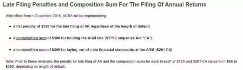 從 2015 年 12 月 1 日起, 新加坡注冊局遲交罰款政策將進行調整, 凡注冊的私人 有限公司到了財政年不進行年審,不及時向政府提交年度財務報表等四項材料, 將被 追加罰款 300 新幣,即在原有的遲交罰款額度的基礎上, 不論推遲時間長短,均再增 加 300 新幣。