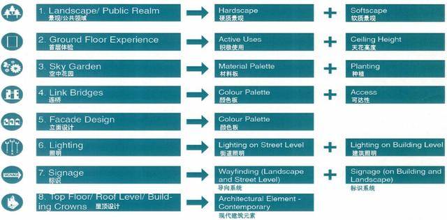 概念規劃中對整體格局的把控,到詳細規劃中通過專項規劃和各項研究不斷的細化和調整,再到開發控制中通則的管理,以及土地競標環節的細致,城市設計作爲一種思維和工具,通過形態引導、管控導則以及設計標准等工具將新加坡的精心規劃一步步傳導到精細實施。