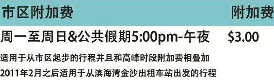 平日3新元機場費用,周日到周日17:00~24:00收取5新元;電話叫車和預約也需另外付費;午夜,加收顯示車資的50%,0:00am-6:00am;以上附加費不會顯示在計價器上,因此有時你會發現司機收費高出發票金額。