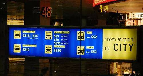 機場裏有許多的大牌子,清楚地標明價格,這些有助于那些對新加坡不熟悉的外國人了解通往城市交通工具的價格。在全世界成百上千的城市中,這恐怕是絕無僅有的。