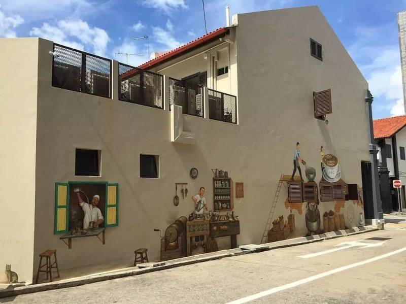 在新加坡蘇丹門(Sultan Gate)A.R.C CAFE的外牆上,一副約12米長的壁畫《咖啡故事》吸睛無數。