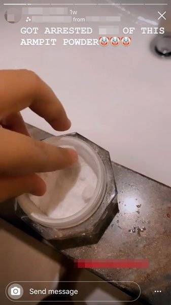 莎洛妮雅上載一張裝有白色粉狀的透明罐子,她稱白色粉末是爽身粉。(取自Instagram)