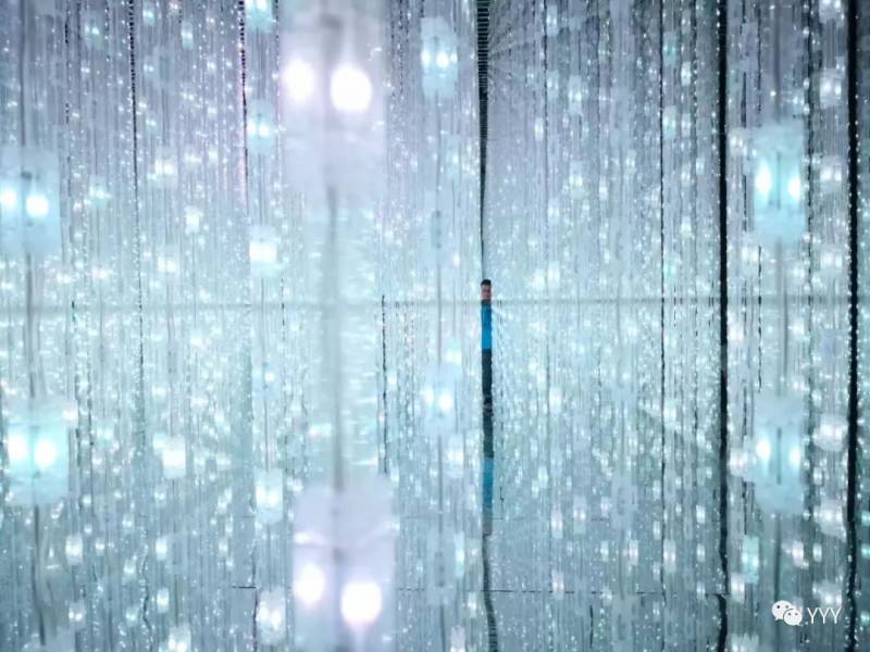 最後一間暗室,是珠子串起的世界。當你走上只容一人的通道,你仿佛走進了宇宙的深邃裏,時間的無涯中。那些上下左右包裹你的珠子,變幻著顔色,亮了暗了紅了綠了,你無從判斷下一秒的變化,你感知著無窮無盡。走到對岸,你像從夢的花花世界裏走出來了,回望曾經滄海。