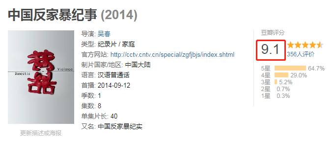 央視曾經播出的紀錄片《中國反家暴紀實》(最高人民法院、最高人民檢察院、公安部、全國老齡委辦公室、全國婦聯、聯合國婦女署(UN WOMEN)、聯合國人口基金(UNFPA)、聯合國兒童基金會(UNICEF)等權威部門合作,並約請相關公益機構和社會知名人士參與拍攝。),真實揭露了這噩夢一般的家庭生活。