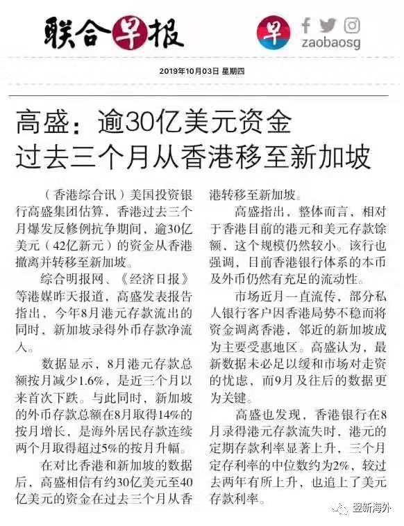 上個月,全球最大的投行之一高盛集團(Goldman Sachs Group)估算,在過去的3個月,30-40億美元的資金從香港撤離,並轉移到新加坡。