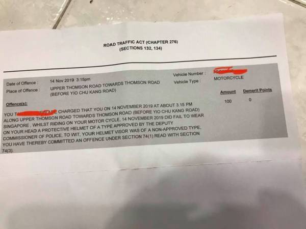 該網民在面子書群組內透露,新加坡警方的罰單,因頭盔罩不符合標准。