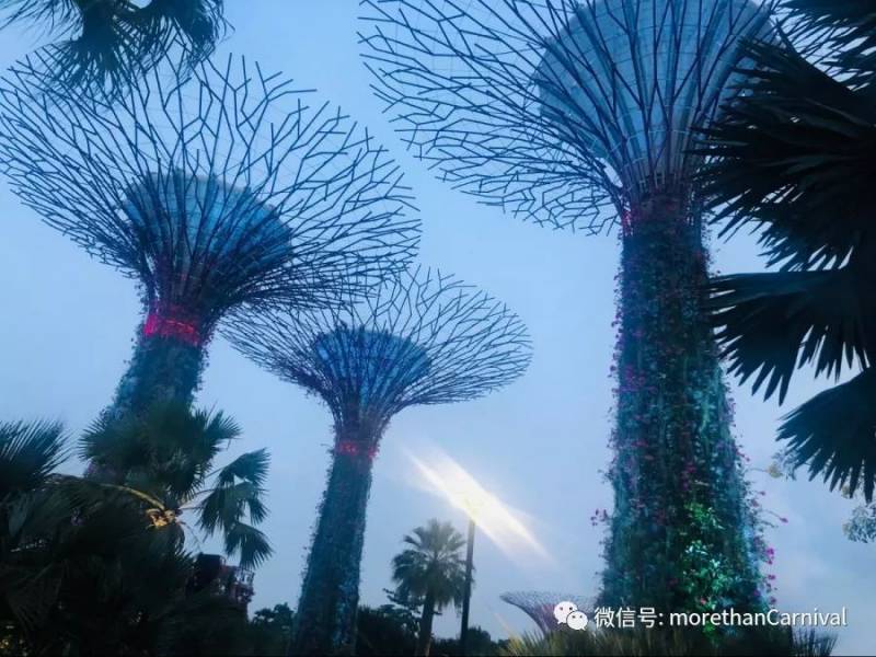 如果說金沙酒店是科幻電影裏的建築,那麽濱海灣花園一定是科幻電影裏的花園。十余株巨型人造天空樹伫立在品種繁多的花草樹木中,仿佛天外來客。