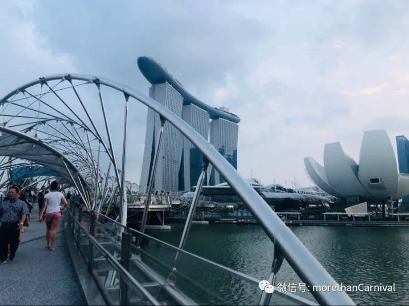 通向金沙酒店的橋叫雙螺旋橋,顧名思義是有兩個螺旋疊加的造型,與金沙酒店的科幻風完美統一,傍晚時分橋上有很多夜跑的人。