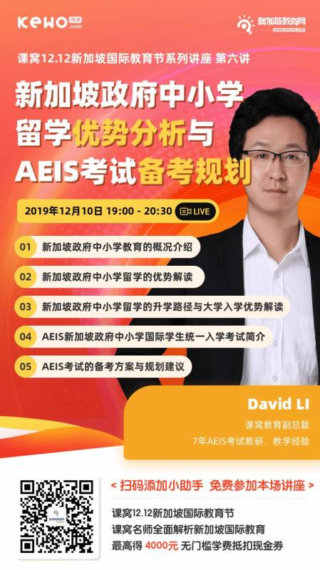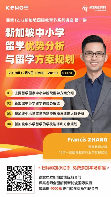 我們雙十二的第一場講座將由課窩總裁 Francis ZHANG爲大家簡單介紹下新加坡低齡留學的優勢之處!