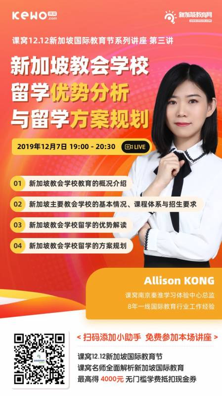 本次活動中,會由課窩秦淮學習體驗中心總監 Allison KONG 爲大家介紹新加坡教會學校的留學優勢和留學方案推薦。