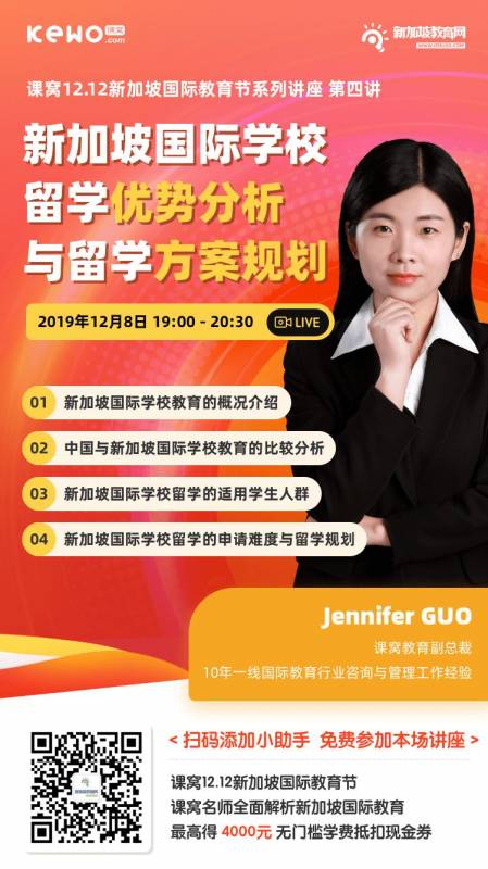 國際學校該如何選擇,本次活動中會由課窩副總裁 Jennifer GUO爲大家具體介紹新加坡的國際學校的留學優勢和留學方案推薦!