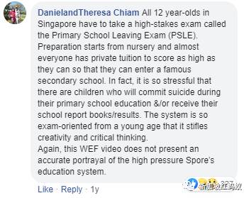 新加坡所有12歲的孩子都必須參加小學離校考試(PSLE),准備工作從幼兒園期間就開始了。爲了考取高分進入一所著名中學,幾乎每名小學生都上私人補習班。實際上,上學的壓力山大,以至于有些孩子在上小學時或收到離校考試成績單時自殺。這種制度從小就以考試爲導向,扼殺了創造力和批判性思維。這個世界經濟論壇制作的視頻並沒有准確地反映出新加坡的高壓力教育制度。