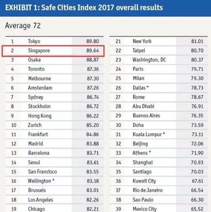 2017年英國《經濟學人》的全球安全城市排名,新加坡以89.64的積分排名全球第二,僅次于東京,無愧于世界安全之都的稱號。新加坡當地媒體還做過一個實驗,記者假裝路人把手機和錢包故意遺忘在熱鬧餐館的桌面,四小時後回來,手機和錢包依然原處不動。