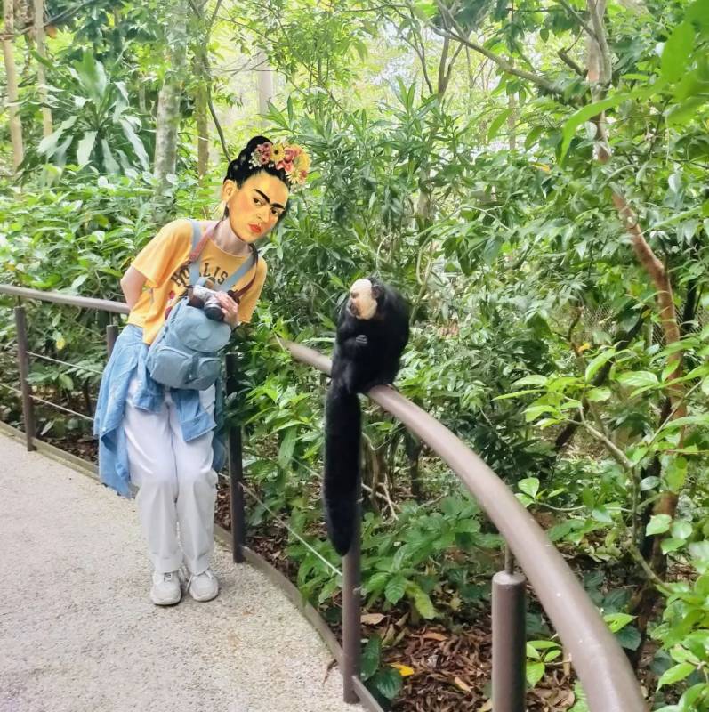 在松鼠猴林裏各種小猴子在眼前上竄下跳。在動物園裏沒見到的白面僧面猴,居然在這裏合影了嗚嗚嗚。