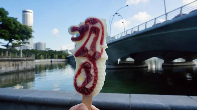 最有名必打卡的地標建築,會噴水的魚尾獅,身後還有一個小的。上一篇提過了,聖淘沙島上的37米魚尾獅是“爸爸”,魚尾獅公園的兩座是“媽媽”和“寶寶”。一個團的朋友買的魚尾獅冰淇淋,我胃不好,吃不了涼的,借來拍個照哈哈哈。