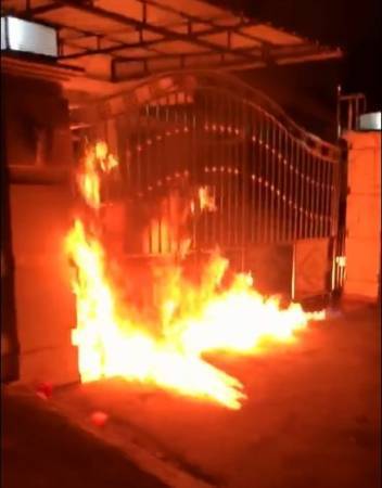 大耳窿朝住家鐵門淋汽油後,點火燃燒。
