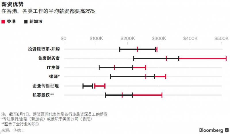 根據彭博彙編的來自招聘公司華德士2017年薪資調查的數據,香港金融行業最高檔次的工資平均比新加坡高出約25%,而且這一趨勢貫穿于多數行業。