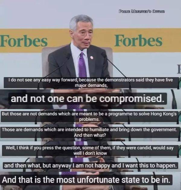 10月16日,新加坡總理李顯龍在福布斯會議上談到香港反對派的“五大訴求”