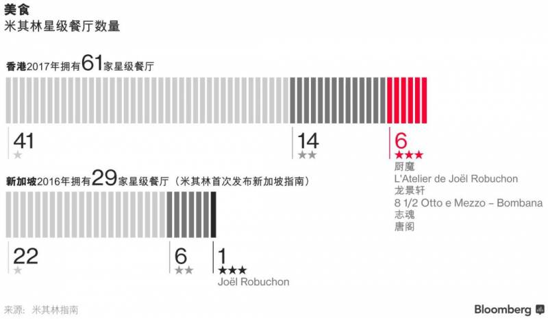 此外,香港擁有61家米其林星級餐廳,其中6家爲三星。新加坡有29家米其林星級餐廳,其中三星的只有Joel Robuchon一家。更多的米其林餐廳意味著更高的生活成本,側面反映了香港的物價水平較新加坡更高。