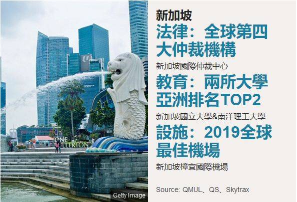 香港和新加坡法律體系相似。同爲前英國殖民地,兩座城市都與英美法系一脈相承,與國際通行法律體系接軌。倫敦大學瑪麗女王學院調查發現,香港國際仲裁中心是“歐洲以外最受歡迎的首選仲裁機構”,全球第三大仲裁機構,以及進步最快的仲裁地。新加坡國際仲裁中心緊隨其後,排名第四,進步程度僅次于前者,位居第二。