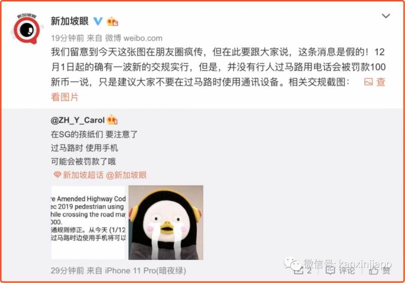 PS:過馬路用手機暫時不犯法,但是,傳播“過馬路用手機罰$1000”這種假新聞,可是犯法的哦~