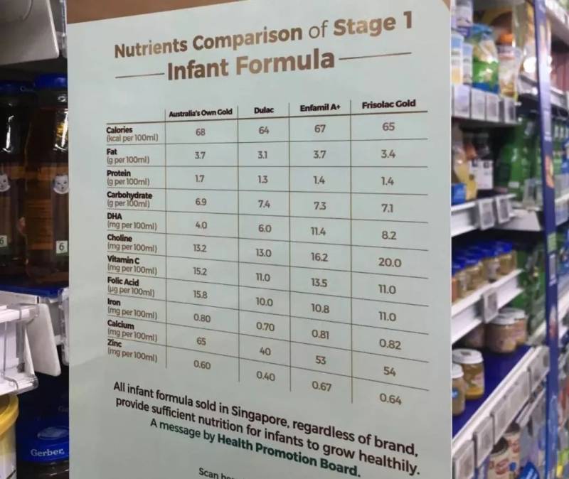 上圖強調:在新加坡正規售賣的所有奶粉的營養含量都是能滿足正常孩子健康成長所需的。