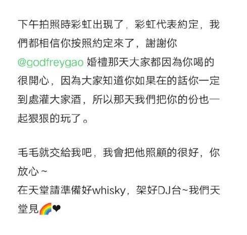 前天Autumn Ying將高以翔參加毛加恩婚禮的畫面畫出,畫中高以翔還抱著愛犬帝歐,並配上歌曲“See You Again”的歌詞。羅雯也分享了這張圖,並配上流淚、愛心和彩虹的符號,似乎相當感動。