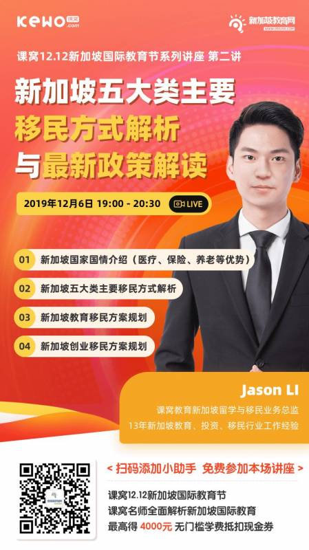 爲了解除大家關于新加坡移民方面的疑惑,我們邀請到了課窩的移民總監Jason LI爲大家詳細介紹新加坡的國情,以及需要准備的材料、流程和注意事項、移民的財産規劃以及2019年最新的移民政策等。