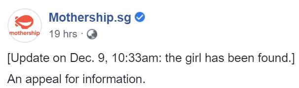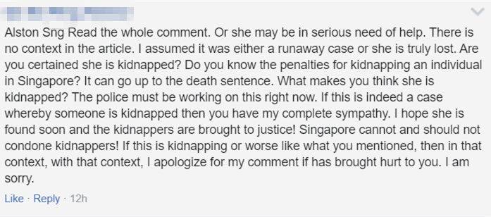 網友也分享了自己的經曆,安慰這位父親說:之前自己5歲的孩子走失了,她比較擔心發生交通意外或者孩子登高的危險。失蹤的女孩11歲,應該不會有交通意外之類的。她還說,在新加坡被拐帶,幾乎是不可能發生的。”