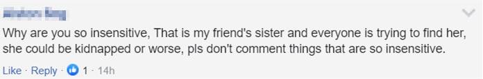 “爲什麽你那麽的不敏感,她可能被綁架了,別評論的如此遲鈍。”