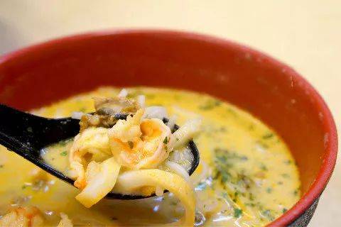 叻沙料足味濃,將粗米粉切成短條加入其中,用勺子即可輕松享用。
