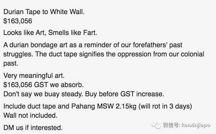 最後良心報價“這是非常有意義的藝術!我們賣163056新幣,免消費稅(新加坡的消費稅馬上要漲了,漲之前記得買喲),包含膠帶、2.15千克的榴梿(將在三天內腐爛),不包含牆。”