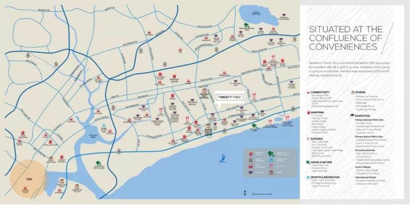 周圍圍著成熟的住宅區,如馬林百列(Marine Parade)和曆史悠久的加東(Katong),如切(Joo Chiat)區,Residence Twenty- Two可以享受周圍大量的設施。除了遍布加東和如切道路的衆多餐館和零售店外,百彙街(Parkway Parade),加東12街(12 Katong)和實乞那集市(Siglap V)等購物中心距離住宅僅一箭之遙,可滿足任何購物需求。