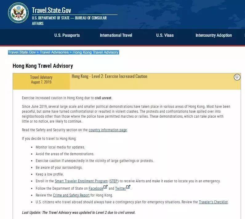 香港暴動發生後,美國國務院發布赴中國香港旅行警示,呼籲美國公民在香港地區活動時需要更加謹慎。