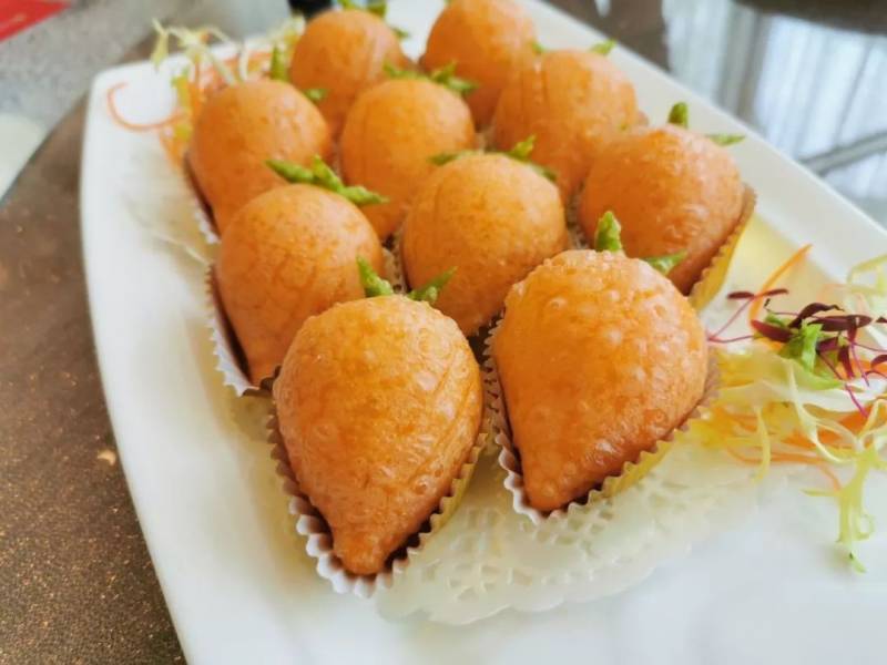 胡蘿蔔泥和面做出來的甜品,個個像飽滿的胡蘿蔔,插上綠葉惟妙惟肖,咬開,裏面還有著紅豆餡料,作爲一道新年餐桌甜品,贊了!