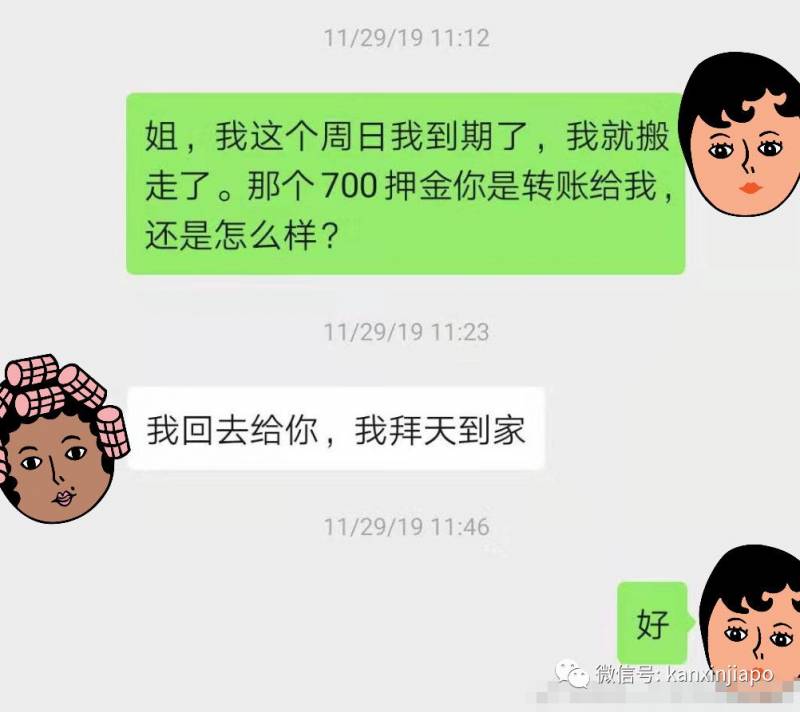 然後就到一個月租滿,我搬走的那天,給她發信息,結果她說她一天後才能從中國回來,回來就把錢給我。