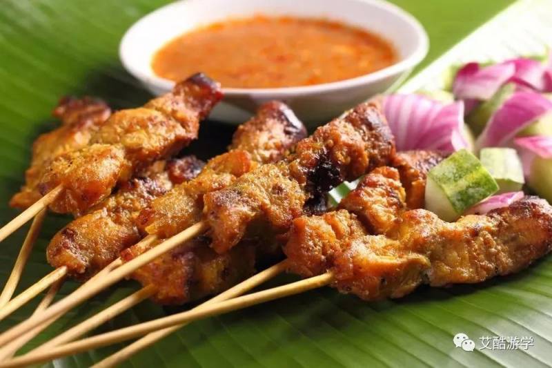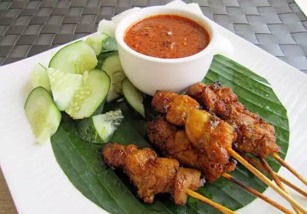 新加坡:沙爹是傳統馬來美食——腌好的牛肉、羊肉、雞肉串成串以適度的火候炭烤後,最最重要的就是要蘸一層厚厚的沙爹醬一起入口。沙爹醬由花生醬、椰醬、幼蝦等調制而成,香醇無比,吃了肯定令人眷戀不已。享用一串串沙爹的同時,再配以椰葉或班蘭葉包裹的傳統馬來米飯、小黃瓜及洋蔥等,入口的沙爹味道更加分明。