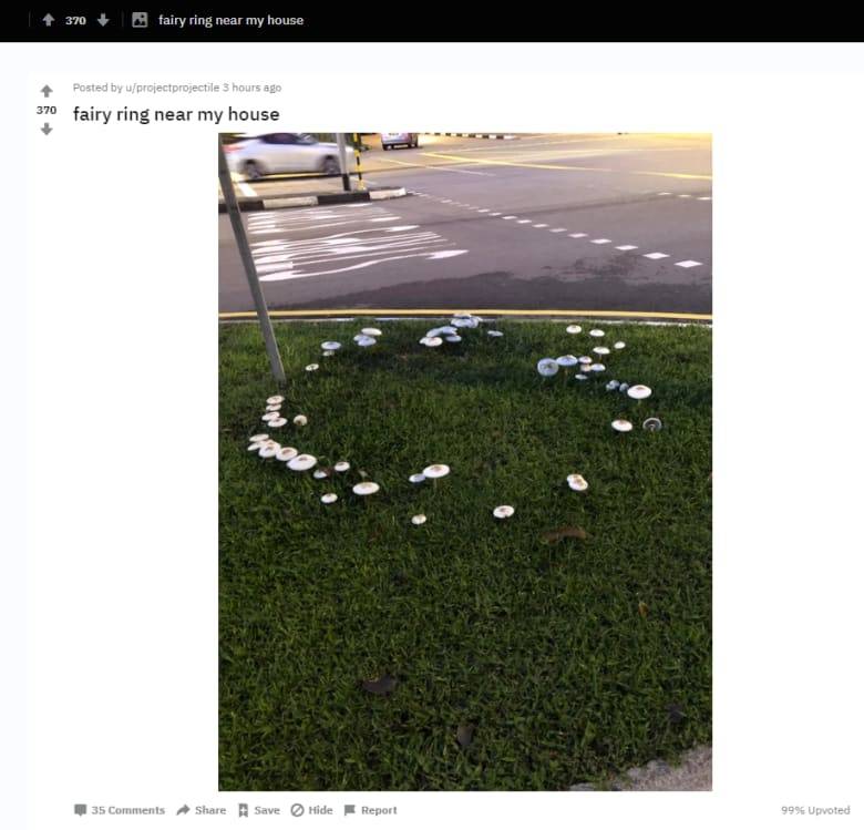馬路邊的草地上,在雨後出現野菇。 圖:shitoupek/ Reddit