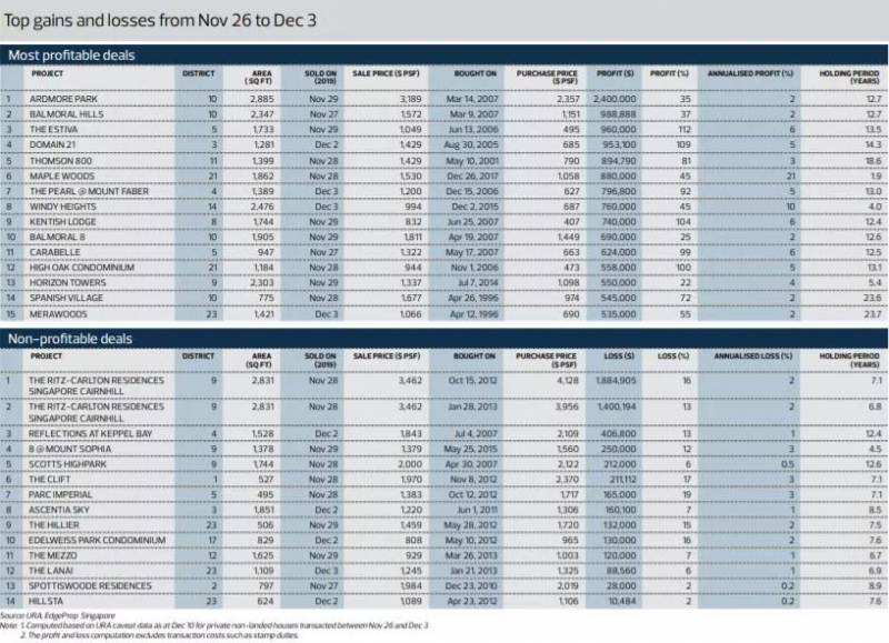另一方面,本周最大的利潤來自于轉售在第十區的Ardmore Park一套2,885平方英尺的公寓。11月29日,賣家以$920萬(每平方英尺$ 3,189)的價格出售了這處房産,獲得了$240萬或35%的利潤。這套公寓于2007年3月以$680萬(每平方英尺$ 2,357)的價格購得。在近13年的持有期裏,這相當于2%的年利潤。