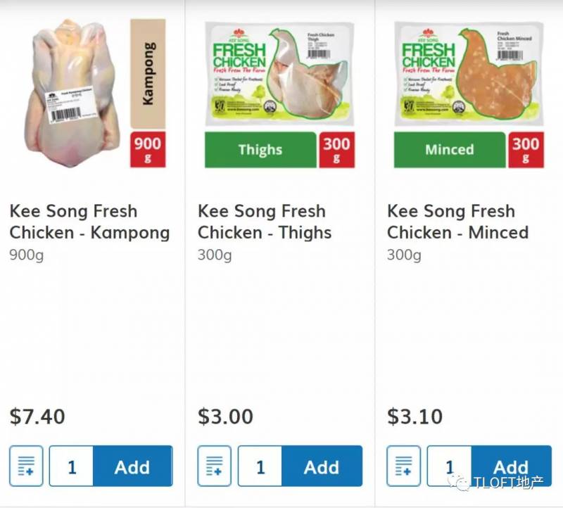 整只雞的價格約7.4新幣(約37人民幣),雞腿300克約3新幣(約15人民幣)。