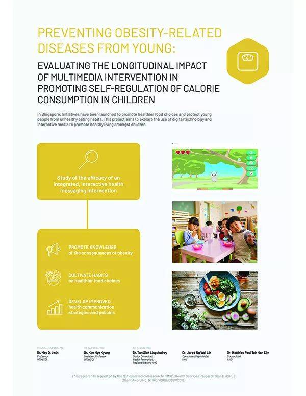 以孩童爲對象去預防肥胖相關疾病。新加坡已經啓動了有關措施,促進健康食品選擇和保護年輕人遠離不健康的飲食習慣,這項研究旨在使用和設計互動媒體,來改善的縱向影響、卡路裏的自我調節和兒童消費觀念。